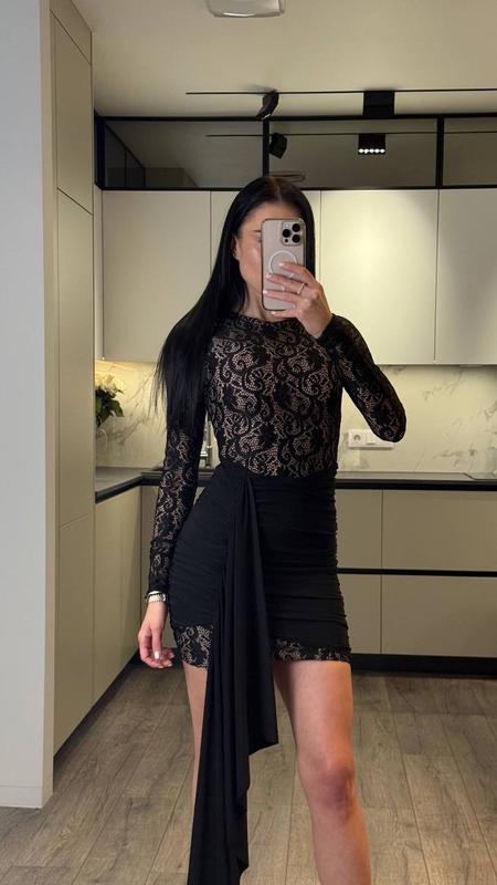 Новинка в наявності 😍 Фото і відео реал ❗️ Сукня ▫️Мод cr 1291 ▫️Тканина - мереживо+масло+трикотажна підкладка ▫️Розміри - 42-44 та 44-46 ▫️Кольори - чорний і молочний ▫️Ціна - 1160 грн 🔝 Сукня, в якій неможливо залишитись непоміченою🫶🏻 Ніжне мереживо, жіночний силует і акцентна драпіровка створюють образ упевненості та елегантної спокуси. Довгі рукави балансують міні-довжину, а асиметрична деталь на талії додає руху та характеру. Ідеальна для моментів, коли хочеться бути в центрі уваги✨