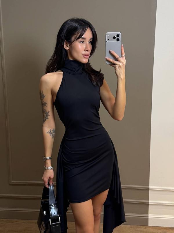 Модель : 144-1432 Обтягивающее платье в длине миди, сборка на задней части юбки с двух сторон вшит шлейф который по желанию можно завязать спереди или носить свободно По спинке потайная молния Цвет: черный Размер : S- M / M- L Ткань : микродайвин