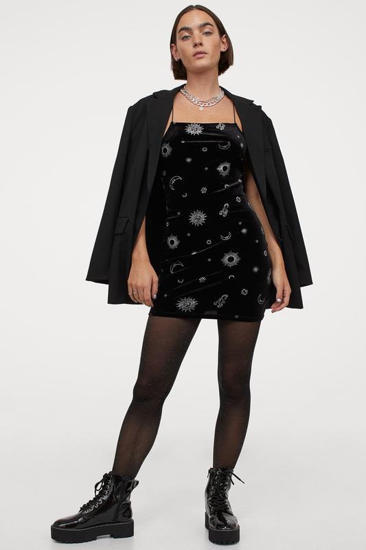 Красива коктейльна сукня зі сріблястим астрологічним візерунком. Гарно виблискує при вечірньому освітленні. Стан ідеальний, без будь-яких нюансів. Тканина - приємний, еластичний велюр/оксамит. Бретельки теж еластичні. Розмір XS Довжина - 79-80 см ПОГ важко визначити через особливості фасону, виробник вказує ОГ 80 см ПОТ - 29-34 см ПОБ - 40-45 см