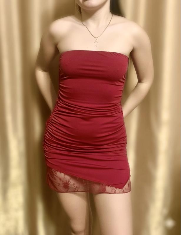 Продам ефектну облягаючу міні-сукню від відомого бренду Motel Rocks у розкішному кольорі Dark Cherry (темна вишня). • Фасон: Облеглий силует бандо (без бретелей) з елегантним драпіруванням по всьому тілу, що чудово підкреслює фігуру та приховує дрібні нюанси. • Особливість: Низ прикрашений асиметричною вставкою з ніжного квіткового мережива. • Тканина: Дуже приємний на дотик, еластичний матеріал (Slinky fabric). Склад: 87% нейлон, 13% еластан. • Стан: Вживана (б/в), стан чудовий. • Розмір: M.