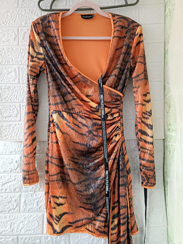 очень красивое интересное платье в пайетки леопринта имеет подплечники,новое, впереди украшено интересным удлинением, длина 87, полуобхват груди 42+, плечи 41, длина рукава 64, полуохват талии 34 + немножко тянется.