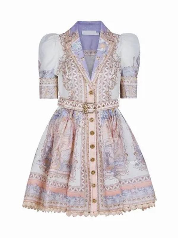 Сукня в стилі Zimmermann 1:1 з морським малюнком і візерунками. Відкладний комір із загостреними лацканами. Пишна спідниця зі складками. Довжина-міні. Короткі рукави-волани з підворотом. Широкий ремінь в тон з пряжкою. Модель з обробкою бісером. Брендові золоті гудзики. Декоративна окантовка по краю подолу і на рукавах. Зріст моделі: 173 см. Параметри: 81/62/91.