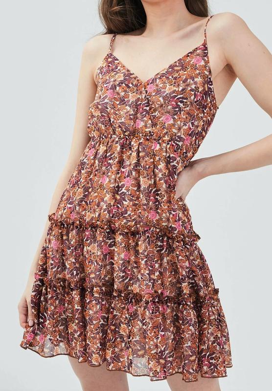 Легкое и воздушное летнее платье-сарафан от бренда Cache Cache с многоярусной юбкой и цветочным принтом. Оно отличается завышенной талией, тонкими регулируемыми бретелями и V-образным вырезом. Платье выполнено в нежных розовых, бежевых и коричневых тонах. Внутри подкладка. Замеры: Полуобъем груди 42 см (если потянуть резинку, которая встроенная сзади - тянется до 47 см) Полуобъем талии 35 см в спокойном состоянии, резинка еще тянется Полуобъем бедер 50-51 см Длина от плеча до низа 85 см (бретельки регулируются) Состав ткани: внешний материал: 100% полиэстер, подкладка: 100% полиэстер.