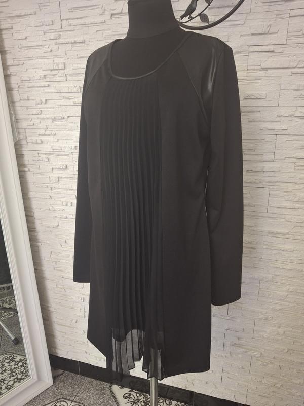 Интересное маленькое черное платье. Имеет акцентную шифоновую вставку по переду и под кожу украшены рукава. Основная ткань плотная с элестаном. Крой свободный. Перед подшитым подкладом. Трапецевидная. Красиво ложится на фигуру. Може бути як туніка. Фантазия ваша. Сукня Нова. Размер M-L. Ширина в груди 51см Длина 88см Длина рукава 66см