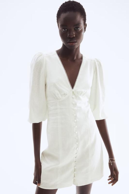 Короткое приталенное платье из воздушной тканой смеси льна и вискозы. Глубокий вырез с V-образным вырезом и отделкой пико, застежки на пуговицы спереди и собранный шов ниже груди. Рукава-баллон длиной 3/4 с узкой резинкой на манжетах. Хлопковая подкладка. Размер: S 1295277001