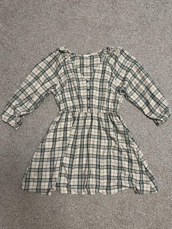 Це міні-сукня з еластичним присбореним ліфом, V-подібним вирізом та рукавами довжиною три чверті в клітчастий візерунок бежевого та зеленого кольорів. Присборена талія, пишні рукави до ліктя, кишені.