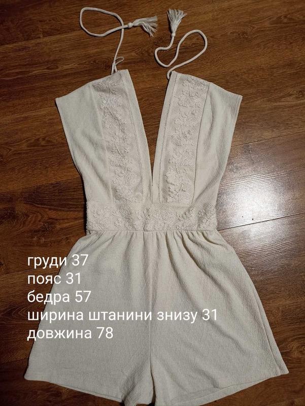 Этот белый текстурированный ромпер Zara с кружевными деталями. Он имеет глубокий V-образный вырез, короткие рукава-крылышки и вставку из кружева в тон на лифе и талии.