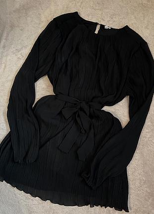 Чорна шифонова сукня з плісировкою на поясі. Є підкладка, рукава прозорі. Розмір S-M. Довжина 85 см Довжина рукава 68 Плечі 38 В талії воно вільне, є пояс, можна і без нього