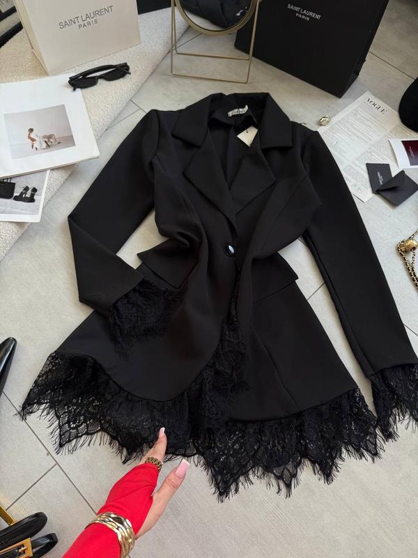 Сукня-піджак✨ Мод: 445 ▪️Тканина: креп костюмка ▪️Розмір : 42-44 , 44-46 ▪️Колір: чорний Елегантне плаття-піджак із дорогим італійським мереживом 💫 Розкішне плаття-піджак у класичному чорному кольорі, створене для особливих виходів. Модель виконана з щільної костюмної тканини та доповнена дорогим італійським мереживом по низу та на рукавах, що надає образу жіночності й вишуканості. Глибоке декольте, акуратний крій та ідеальна посадка роблять цю річ справжнім фаворитом у гардеробі. Стильний акцент — ніжна мереживна вставка, яка додає легкого шику та преміального вигляду.🖤 Брошка та пояс у комплект не входять. _____________________________