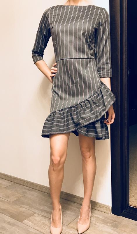 Короткое платье в полоску серый с розовым воланы элегантное платье