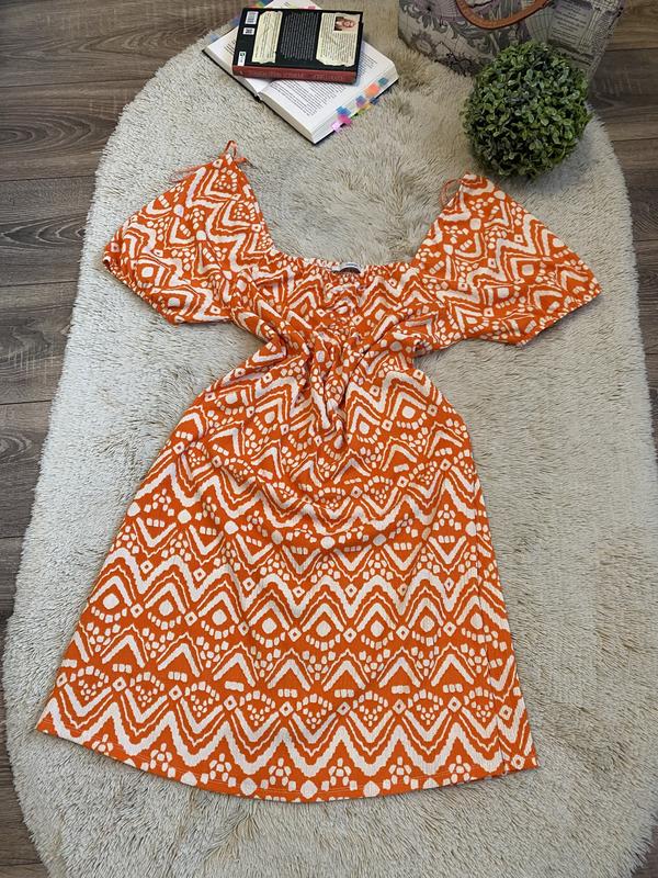 ❗️Кожна третя (найдешевша) річ у подарунок (1+1=3), за умов «оплати на картку»❗️Всі деталі в профілі «про мене»❗️помаранчева міні-сукня з абстрактним візерунком та рукавами-ліхтариками розмір XL, можна 2XL. Еластичний виріз горловини, короткі еластичні манжети на рукавах-ліхтариках, еластична присборена спинка, текстурована тканина «джерсі». Довжина від плеча 98см., півобхват грудей 46см., низ 68см., довжина рукава 30см. Стан ідеальний.