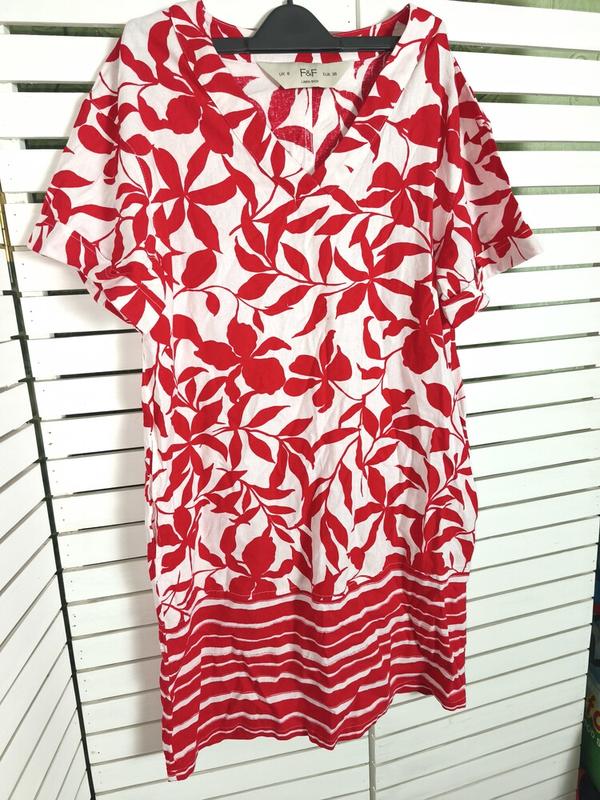 Яркое женское платье из натуральных материалов. Длина 92, пог 52 бедра 55. свободный прямой крой, короткий рукав есть карманы. Выглядит как трошечки полировала но если присмотреться на свет, то это чистый белый цвет.