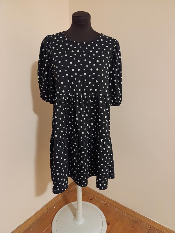 Продам платье стильное, размер М, мирного цвета в белый горошек, свободное от груди. Замеры: ширина плеч 36, полуобхват груди 48, длина рукава 32(три четверти), длина платья 82.