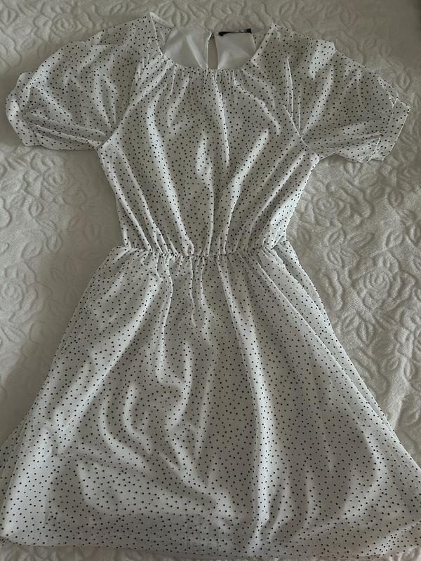 Сукня білого кольору в дрібний чорний горошок. Має короткі рукави з легким підворотом, округлий виріз горловини та невеликий розріз із застібкою ззаду. Талія на резинці. Сукня має підкладку. Розмір вказаний XXS, але за рахунок фасону та резинки на талії добре сидить і на S.