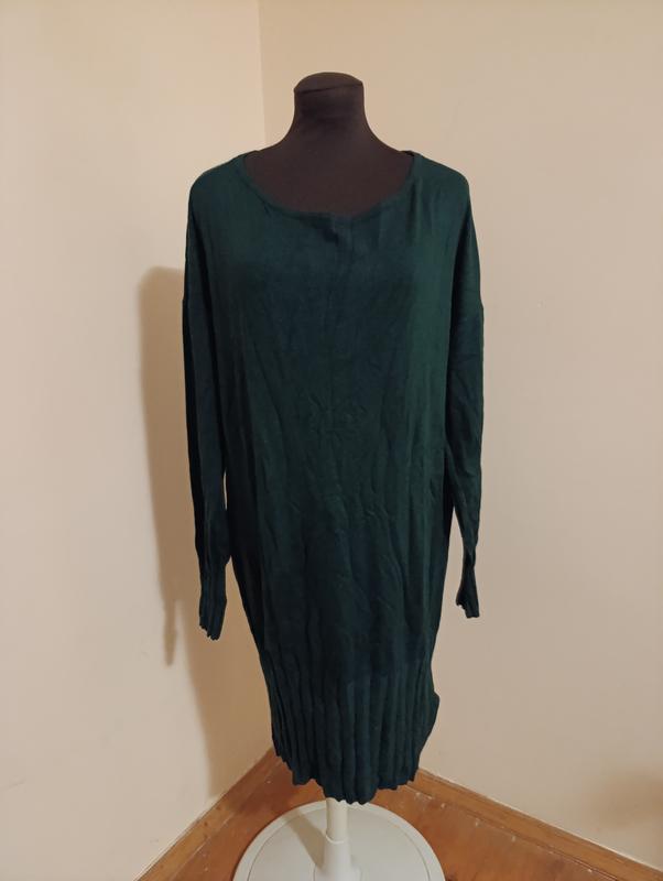 Платье вязаное, стильное, темно - зеленого цвета. Размер L, XL. Ширина плеч 50, полуобхват груди 60, длина рукава 68, длина 90.