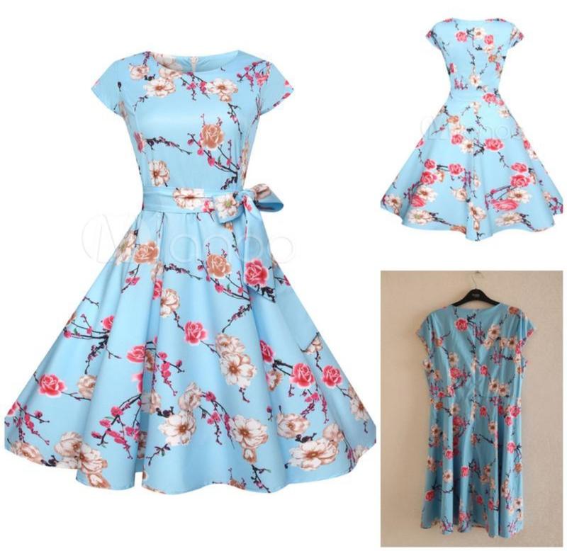 ПОГ 52 ПОТ 43 Длина 102 Полиэстер На спинке внутренняя молния Фасон: Классический силуэт "new look" с приталенным верхом и широкой юбкой-солнце. Такой крой выгодно подчеркивает талию и добавляет образу легкости. Цвет и принт: Нежно-голубой фон, украшенный изящным цветочным принтом в виде веточек сакуры или яблони с розовыми и кремовыми цветами. Детали: Горловина: Лаконичный круглый вырез ("лодочка"). Рукава: короткие рукава-крылышки, едва прикрывающие плечи. Талия: Акцентированная широким вшитым поясом, который завязывается на кокетливый бант сбоку или спереди. Застежка: скрытая молния на спинке для идеальной посадки по фигуре.