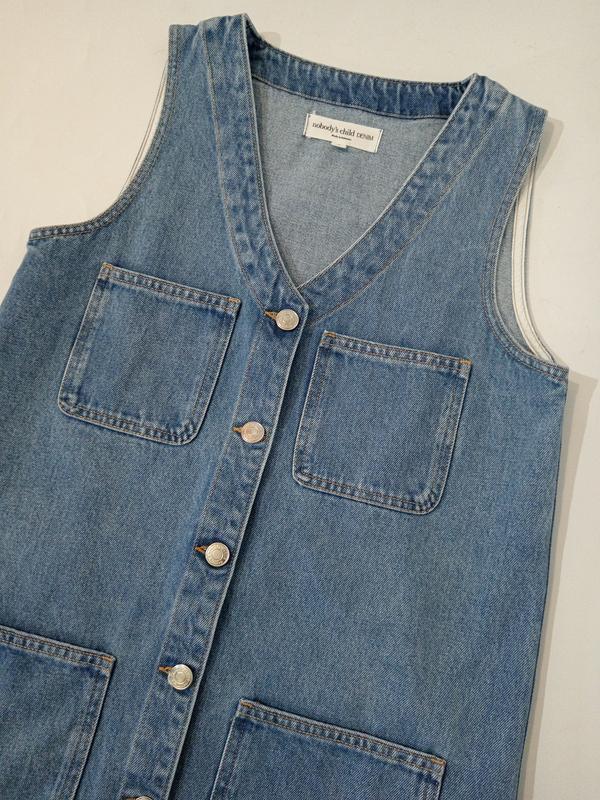 Джинсовое платье - сарафан с V-образным вырезом. Застегивается спереди на пуговицы. Спереди четыре накладных кармана. Размер указан UK 8, EUR 36. ✔️ плечи 32 ✔️ ПОГ 45 ✔️ ПОТ 48 ✔️ ПОБ 50 ✔️ ширина по низу 56 ✔️ длина 85 Новое, без бумажной бирки.