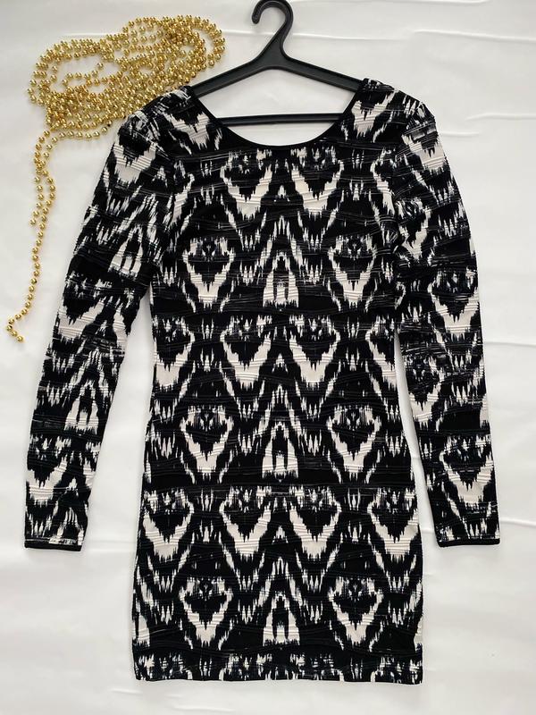 обтисла сукня з довгими рукавами виконана в чорно-білому кольорі з абстрактним візерунком (який часто описують як принт ікат або ацтекський візерунок). Сукня має круглий виріз горловини спереду та відкриту спину.