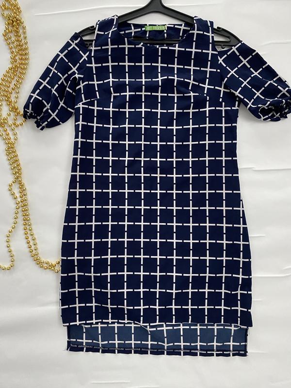 темно-синя сукня з білим картатим візерунком і вирізами на плечах — популярний повсякденний або коктейльний фасон Особливості: Має модні вирізи на плечах ("холодні плечі") та короткі рукави-ліхтарики. Стиль: Універсальний варіант, який можна носити як на роботу в офіс, так і на більш офіційні заходи чи вечірки.