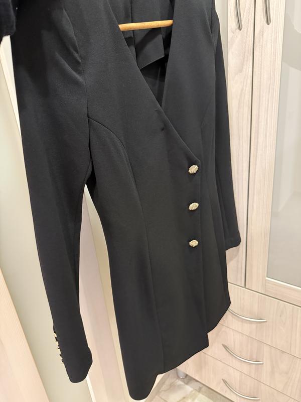 Чорна сукня-піджак розмір xs-s.( більше підійде на розмір с) але важко так сказати треба міряти Сукня Має вставні плечики що гарно тримають форму Позаду Застібається на замок Є прихована нашита кнопка в зоні декольте(якщо малий бюст щоб плаття не відтопирювалось) яку можна зняти за потреби В гарному стані Бренд crystal P.S. вживу колір темно-чорний ( фото не передає)