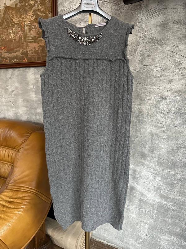 Вʼязане шерстяне плаття Ermanno Scervino сірого кольору з красивим візерунком «коси» та декоративною вишивкою з бісеру й камінців у зоні горловини. Склад: 80% wool, 20% nylon, м’яка, тепла, приємна до тіла. Розмір: на бірці вказано 16 років, але по факту добре підійде на XS–S (орієнтуйтесь на заміри) Стан: ідеальний
