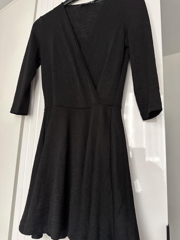 Елегантна чорна сукня міді з запахом. Приталений силует, V-подібний виріз, рукав 3/4. Легка спідниця красиво струмує та підкреслює фігуру. Стан відмінний.