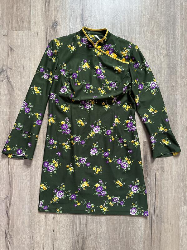 Оригінальна сукня у східному стилі. Принт квіточки на темно зеленому фоні. Єдина така, бо це Індпошив. Прямий трохи приталений крій. Тканина вінтажна, приблизно 70х років. Застібка молнія на спинці, є на фото. Оригінально декоровані рукава, Низ трохи асиметричний. З боків є розрізи. Ног 54 Нот 49 Нос 55 Довжина 102 см. Склад тканини орієнтуєтовно нейлон або ПЕ. Можна носити як туніку зі штанами,