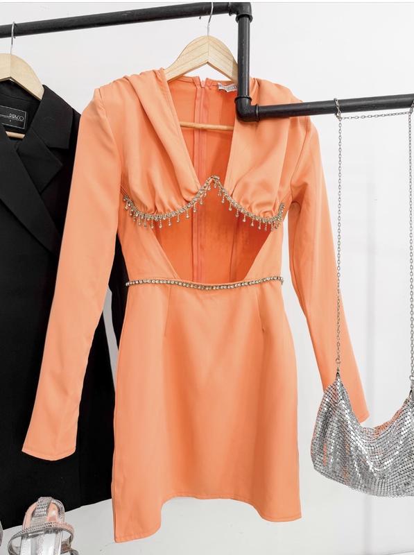 персикова сукня з камінчиками розмір XS напівобхват: груди-38см+чашка талія-32см(потягнеться до 33см) стегна-44см(потягнеться до 46см) рукав-62см довжина сукні-78с