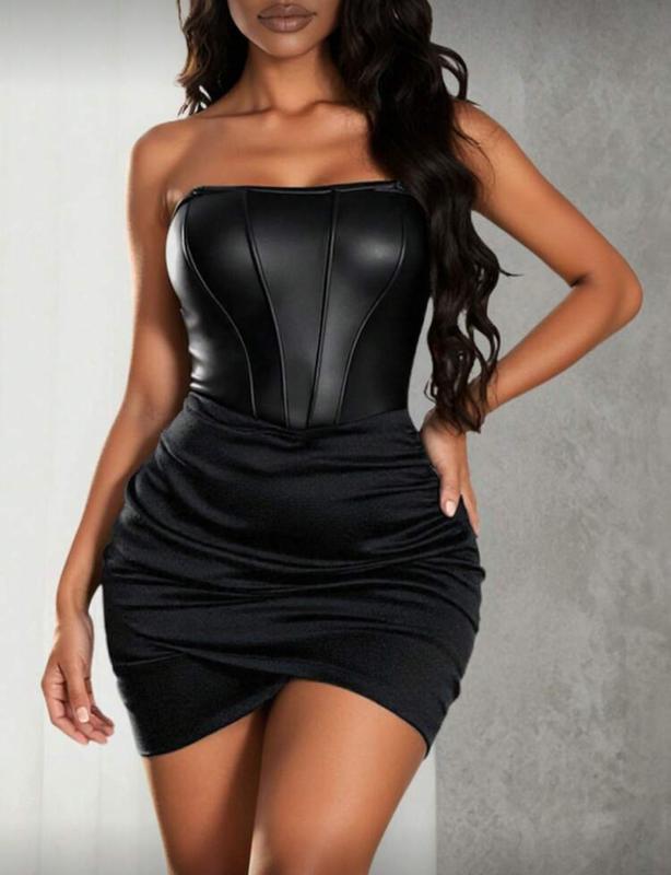 Елегантна чорна сукня від Shein у новому стані. Особливості: • Корсетний верх зі штучної шкіри з декоративними швами • Облягаюча спідниця з асиметричним краєм • Без бретелей для ефектного образу • Розмір: L-XL Матеріал: • Верх: штучна шкіра • Склад: 90% поліестер, 10% еластан Стан: новий, жодного разу не використовувався. Ідеально підходить для вечірніх виходів, вечірок та особливих подій.