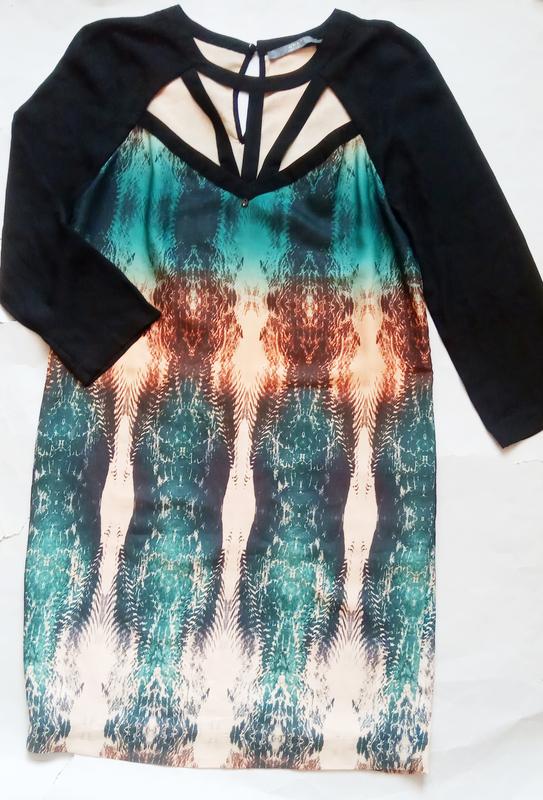 Эффектная модель с трендовым вырезом и декоративными ремешками спереди. ЧОрные рукава 3/4 добавляют контраст, а яркий градиентный принт в оттенках бирюзы и теплого бежа смотрится очень стильно и привлекает внимание. Фирменный металлический логотип Guess с камешками- оригинальная деталь бренда. Платье отлично подойдет как для свидания, вечеринки, так и для личного события. Заг длин - 88см Рукав-54 НОТ- 42 НОГ-41 НОБ-44-45 Размер-XS-S. Стан идеален.