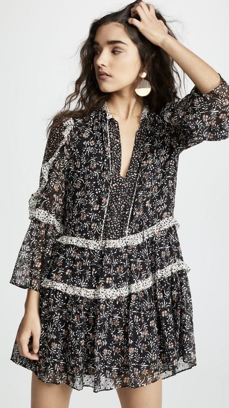 изысканное платье от нью-йоркского дизайнера в узнаваемом стиле бренда - сочетание богемного шика, легкости и безупречного качества материалов. Женственный А-силуэт с многоярусной юбкой и акцентными рюшами на плечах и рукавах. Цветочный в приглушенных тонах, дополненный контрастными вставками. Глубокий V-образный вырез с завязками, свободные рукава 3/4, создающие летящий образ. Размер US 4 (подойдет на S или небольшую M, ориентируйтесь на замеры). плечи-35 см пог-46 см пот-44 см длина -84 см