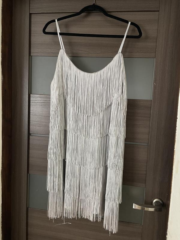 Ефектна сукня світло-сірого (сріблястого) кольору від Reserved. На тонких бретелях, повністю оздоблена ярусною довгою бахромою – неймовірно виглядає в русі ✨ Ідеальний варіант для вечірки, свята, фотосесії або тематичного заходу. Розмір: EUR 40 / UK 12. Стан: дуже хороший.(одягнена 1 раз на вечірку)
