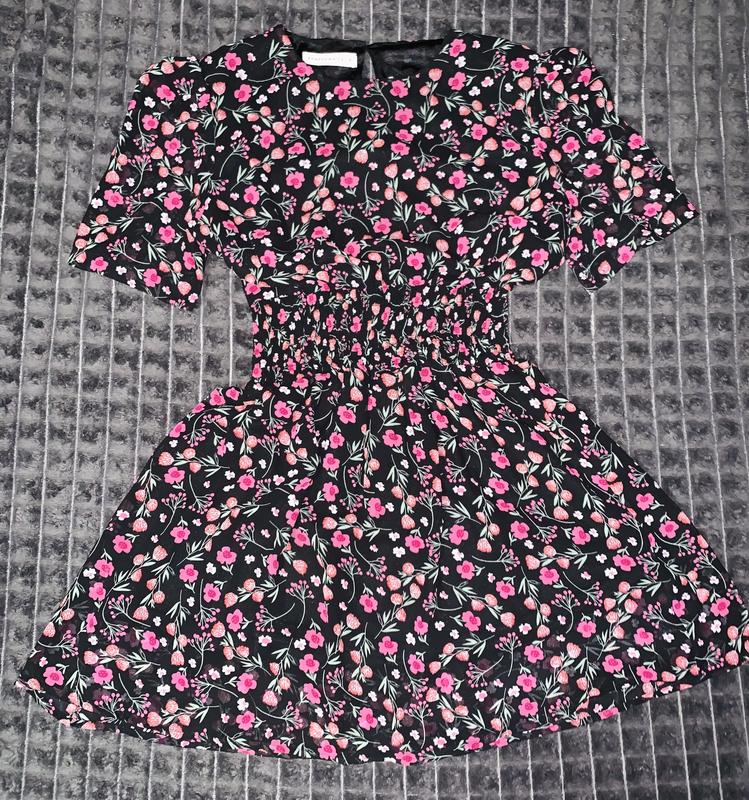 Легка коротка сукня з ніжним квітковим принтом створює романтичний та жіночний образ. Модель має витончений контур, який красиво підкреслює фігуру. Рукава оздоблені еластичною резинкою, що додає комфорту та створює легкий об’єм. Талія також оформлена резинкою, завдяки чому сукня гарно сідає по фігурі та підкреслює силует. Ідеальний варіант для прогулянок, відпочинку чи святкових подій.