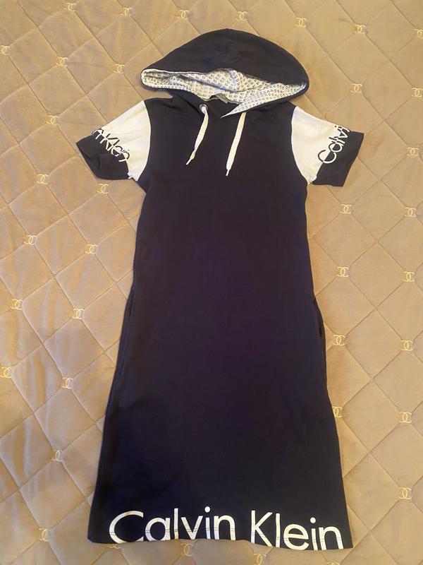 🔹 Модель з капюшоном та коротким рукавом 🔹 Контрастні білі рукави з фірмовим написом 🔹 Декоративна шнурівка на капюшоні 🔹 Великий логотип Calvin Klein внизу сукні 🔹 Прямий крій, комфортна посадка 🔹 М’яка та приємна до тіла тканина Ідеальний варіант для повсякденного носіння, прогулянок або активного відпочинку. Поєднується з кросівками чи кедами для створення стильного casual-образу. Стан — виглядає охайною та доглянутою (можна додати фактичний стан і розмір).