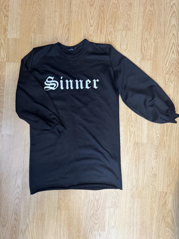 Стильна коротка чорні сукня з надписом на грудях. Внизу необроблений низ, рукави ліхтарики. Беж нюансів, розмір С.