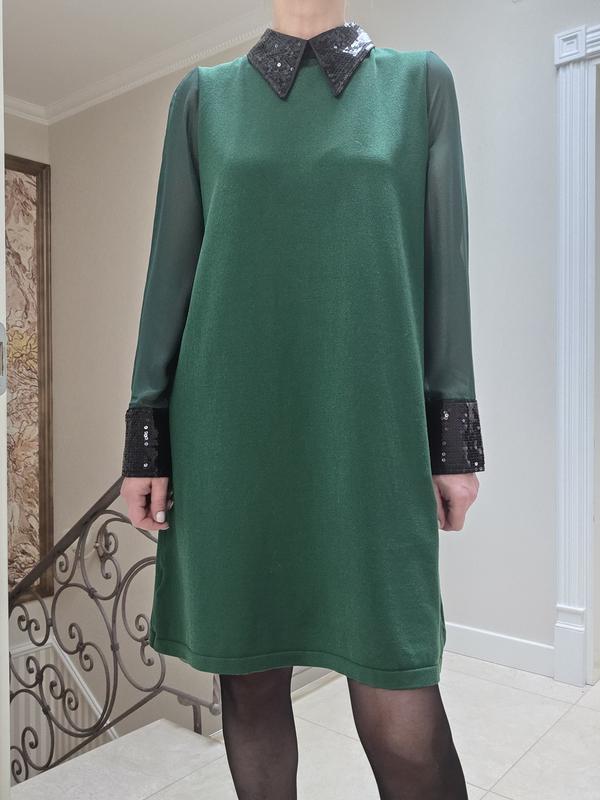 Платье комбинированное, красивый изумрудный цвет, приятный, трикотаж. Вдягнена на м,краще сяде на л. плечи38 пог 51 пот 52 поб 54 длина94 тканина тепленька,тягнеться.