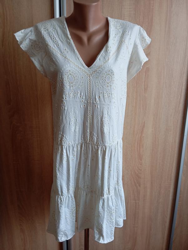Изделие выполнено из натурального хлопка с перфорацией (прошвой). Дизайн: Платье имеет V-образный вырез, короткие рукава с воланами и многоярусную юбку свободного кроя.