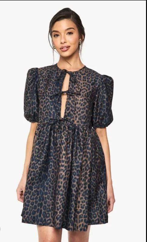 Это коричневое платье с леопардовым принтом, украшенное на завязки спереди и короткими рукавом-фонариками.Модель свободного кроя.Длина 94см.Пог 62см.Пот59см