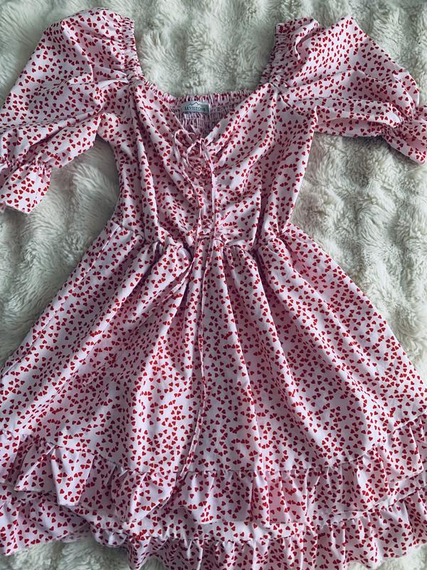Сукня в сердечка Ніжна літня сукня з романтичним принтом ❤️ Пишні рукави, шнурівка спереду, красиво підкреслює талію. Легка й повітряна — ідеальна на літо. Тканина: легкий поліестер (приємна до тіла, не парить). Стан: дуже хороший Розмір: S ⚡️ Швидка відправка ✨ Дуже жіночна та мила модель