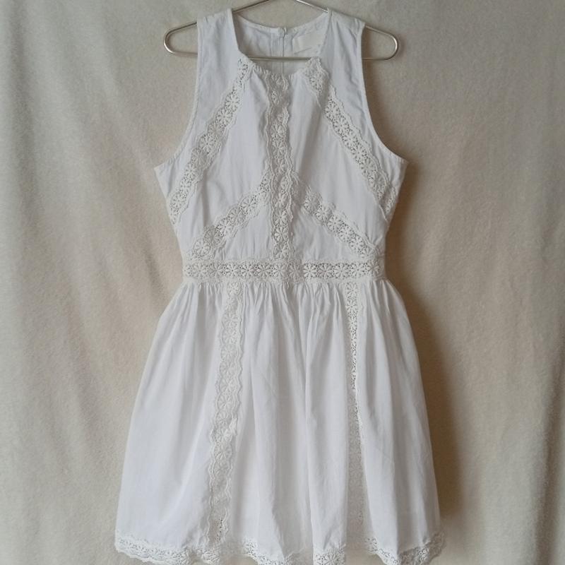 платье из хлопка с подюпником. застегивается сзади на молнию. белоснежное с кружевом очень девчачье нежное.пог-40 пот-34 длина -82. Состояние не новое, без нюансов.