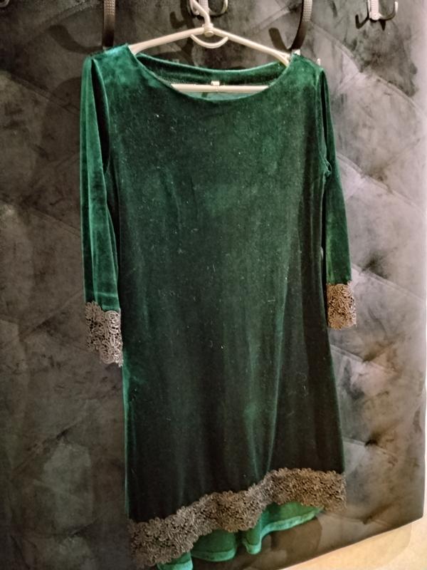 Платье велюр в красивом зумрудном цвете. Рукав три четверти. Низ платья и рукава отделаны кружевом. Размер 46.