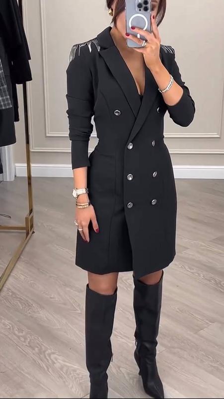 Платье - пиджак Модель 8390 / 600 Цена: Цвет: черный Размер : 42-44 Тканина : костюмка Невероятно стильно и модно, задень актуальное платье - пиджак. Идет без подкладки, имеет плечичики, застегивается на пуговицы, на плечах имеет декор - серебряные цепочки. Изделия идет на пуговицах! Об’єми можно зменьшити Размер 42-44 Объем груди - 94 см Талия - 72 см Обєм бедер - 98 см Длина - 88 см Изделия идет на пуговицах! Об’єми можно зменьшити