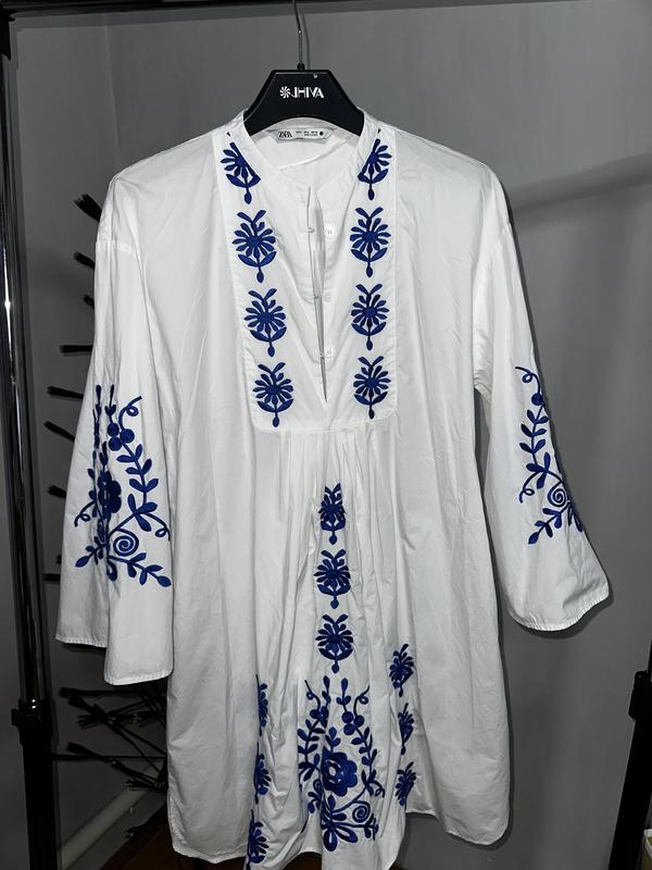 Офігенна сукня Zara. Створена з дуже приємного до тіла матеріалу( тіло реально дихає в ньому). Дуже якісно виконана вишивка. Довжина сукні по спині 90 см, на переді довжина 85 см. Довжина рукава 43 см. До серединки защіпається на ґудзики. Написано розмір S але чудово сяде на M.