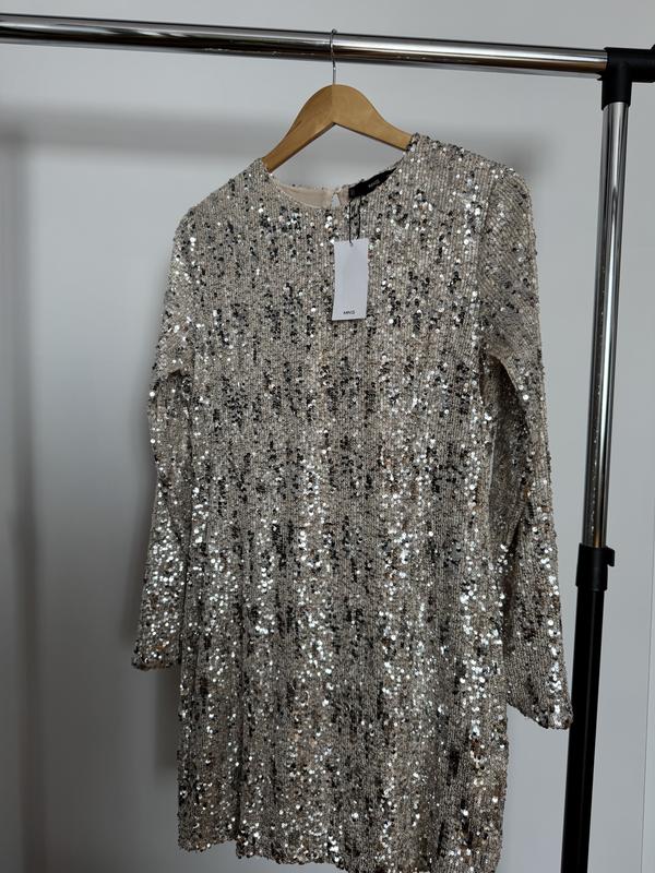 Сукня з паєтками Mango, розмір L. Гарно тягнеться та чудово лягає на фігуру. Довжина виробу-90 см, довжина рукава-62 см, ширина плечей-40 см, півобхват грудей-50 см, півобхват талії-45 см