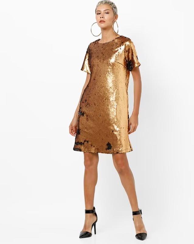 Сяюча золота сукня з паєтками від Amber Design (Milena Amelchenko) Створіть незабутній образ для особливої події! Ця сукня — справжній магніт для поглядів. Вона ідеально підійде для вечірки, святкування Нового року, дня народження чи будь-якого урочистого заходу. Основні характеристики: • Бренд: Amber Design by Milena Amelchenko. • Колір: Розкішне золото з ефектом «хамелеона» (паєтки переливаються та змінюють напрямок, відкриваючи темну основу). • Стан: Нова, з оригінальною етикеткою. • Крій: Класичний прямий силует, що не сковує рухів. Особливості моделі: • Декор: Вся поверхня сукні густо розшита дрібними паєтками, які створюють неймовірний блиск під час руху. • Рукав: Короткий вільний рукав для комфортної посадки. • Комфорт: Сукня має м'яку внутрішню підкладку чорного кольору, тому вона приємна до тіла та не «колеться». • Деталі: Виріз горловини — акуратний круглий (човник). Чому варто обрати цю сукню? Розмір S (42/44) Це дизайнерська річ («Amber from Paris»), яка виглядає дорого та стильно. Завдяки двостороннім паєткам ви можете власноруч створювати унікальні візерунки на тканині, просто провівши по них рукою.