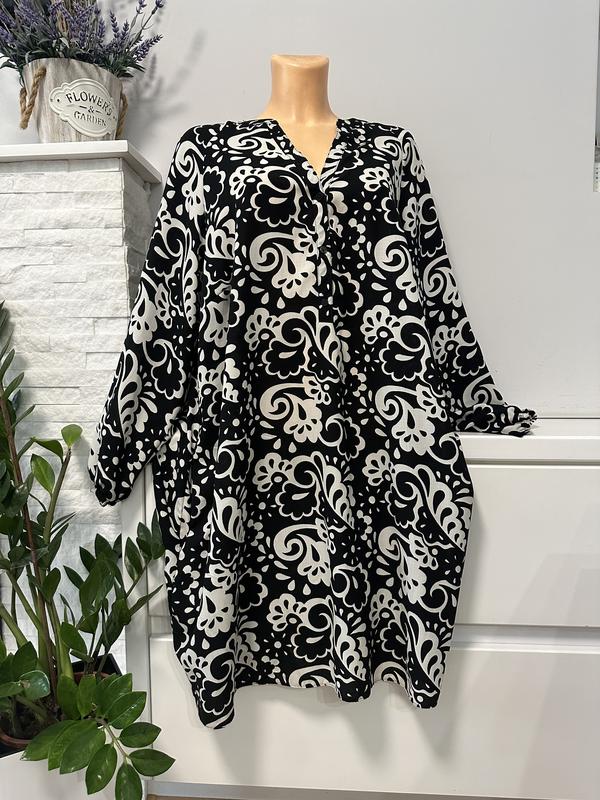 Це чорно-біле вільне плаття з візерунком пейслі та абстрактними мотивами вільного крою Присутні кишені Р.20,довжина99,Пог 62 Бедра 70