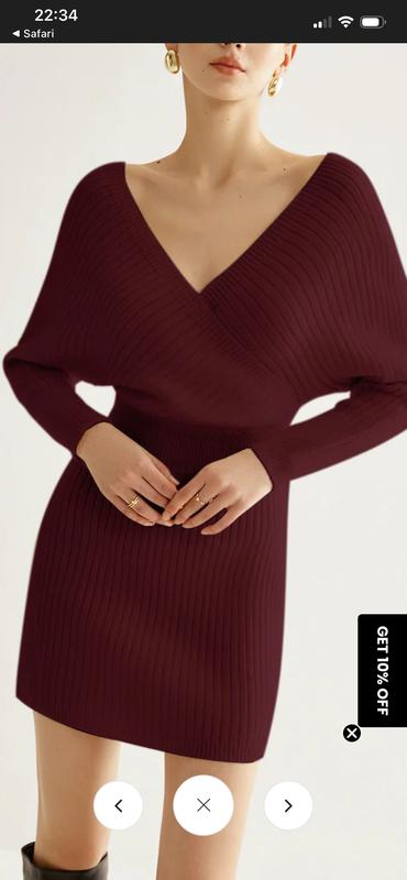 бордова сукня з перехресним V-подібним вирізом та рукавами типу «кажан» представлена в кількох онлайн-магазинах. Вона характеризується облягаючим силуетом, довжиною міні та виконана з трикотажу в рубчик. Тканина тепла, мягенька, добре тягнеться, лягає по фігурі