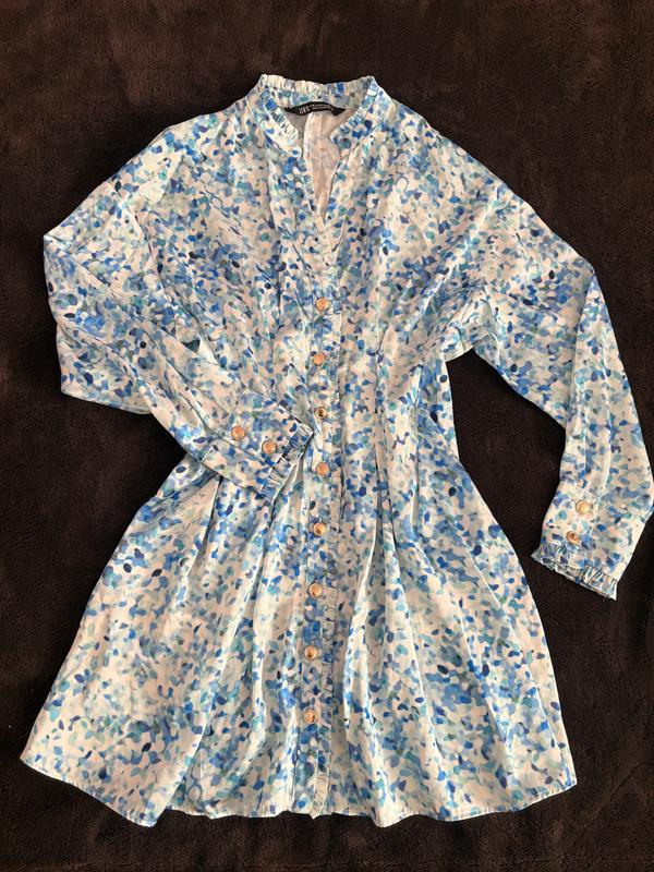 Сукня Zara, дуже гарний колір та фасон, розмір М, так і буде, якісна тканина, дуже гарна золота фурнітура, але є пару нюансів(зачіпка на правому плечі сзаду та стрілочка по внутрішній стороні, де застібаються ґудзики, фото прикріпила), при носці не видно взагалі напівобʼєм грудей 45 см в спокійному стані + є виточки, талія до 40, стегна вільні десь 65 см, довжина 82 см
