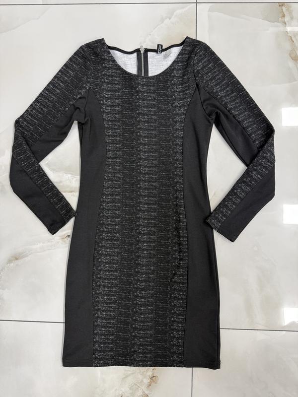 Короткое платье с длинными рукавами от бренда H&M, выполненное из смеси вискозы с серой меланжевой вставкой, в идеальном состоянии. Размер 34. Замеры: длина 79см, пог 36см, по талии 30см, по бедрам 37см, рукав от шва 55см, плечи 33см, ткань тянется.