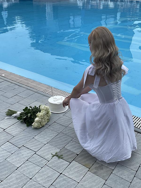 Корсетна коротка сукня , шита під замовлення. Колір - білий. Тканина - шовк. Довжина спіднички від талії до низу 43 см. Я 165( на фото) Груди 85 Талія 63 Бедра 83